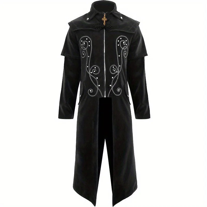 Der Steampunk Herrenmantel ist ein Meisterwerk viktorianischer Eleganz, das die Aura vergangener Zeiten mit einem Hauch geheimnisvoller Romantik vereint. Seine markante Länge, kombiniert mit kunstvollen Stickereien, macht ihn zu einem Kleidungsstück, das sofort ins Auge fällt und die Präsenz seines Trägers verstärkt.