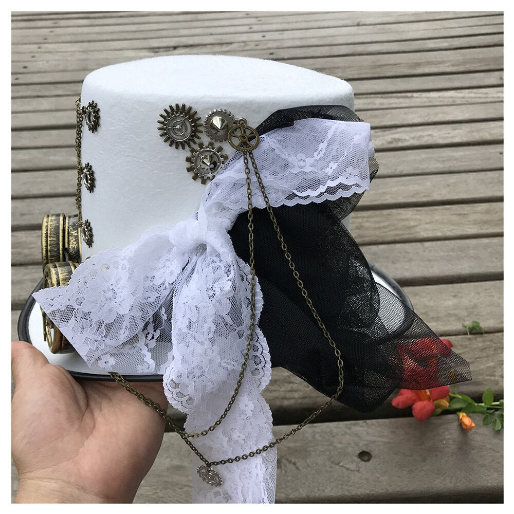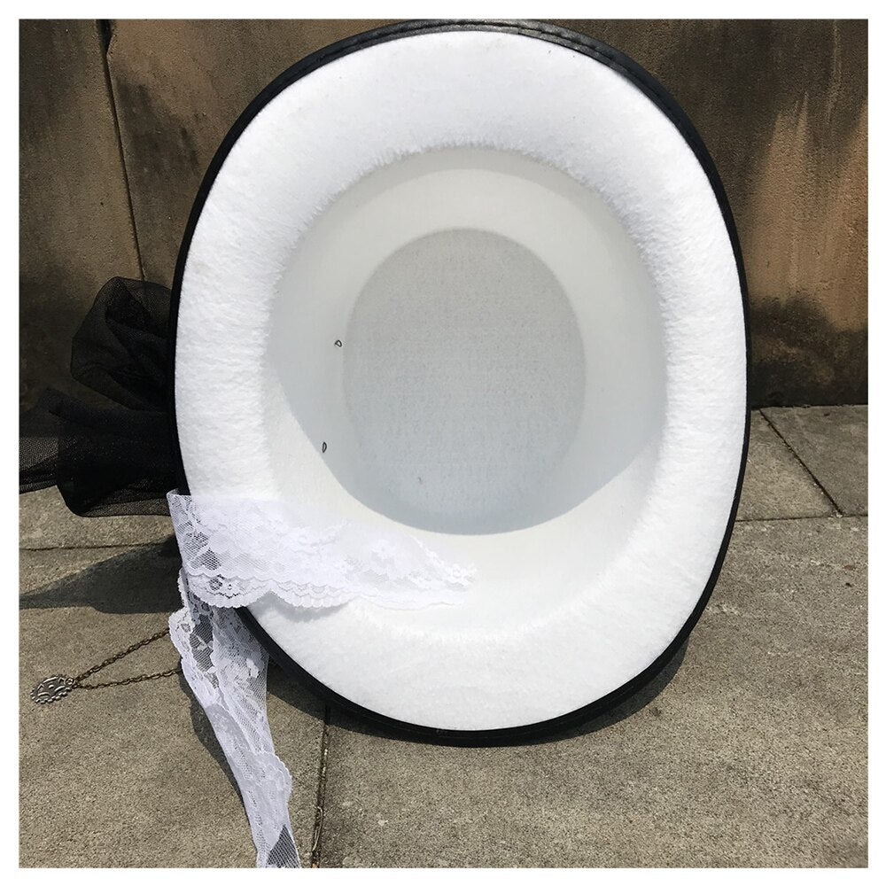 An der Seite des Hutes hängt ein zarter Schleier aus schwarzer und weißer Spitze, der dem Hut eine romantische Note verleiht und die traditionelle Hochzeitsästhetik mit der einzigartigen Steampunk-Optik verbindet. Diese Spitze fließt sanft im Wind und symbolisiert die Eleganz und Anmut des besonderen Tages.