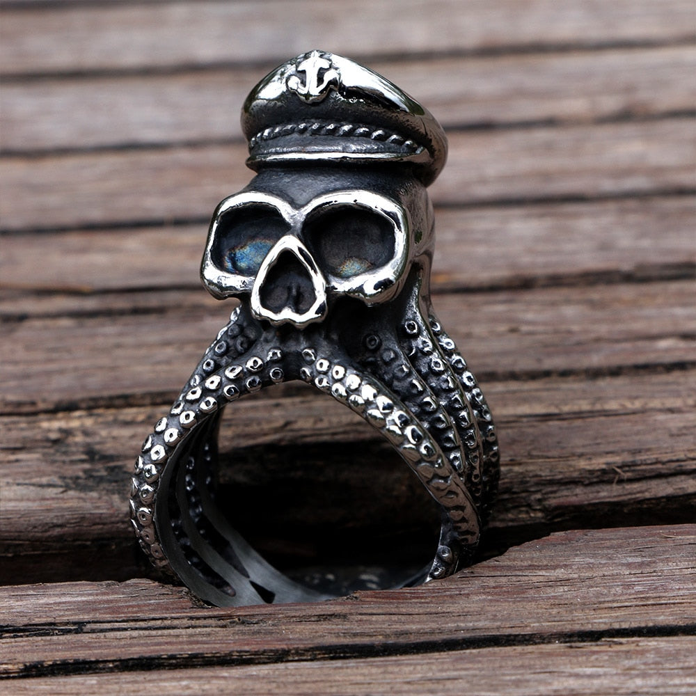 Der Steampunk Kraken Totenkopf Ring ist ein markantes Symbol für Macht, Mysterium und die ungezähmten Kräfte der Tiefe. Der Ring zeigt eine faszinierende Verschmelzung: ein Totenkopf mit Kapitänsmütze, aus dessen Basis sich die Tentakel eines Kraken winden. Die detailreiche Gestaltung der Tentakel, kombiniert mit dem grimmigen Ausdruck des Schädels, erzeugt ein Bild von nautischer Autorität und unbezwingbarer Wildheit.