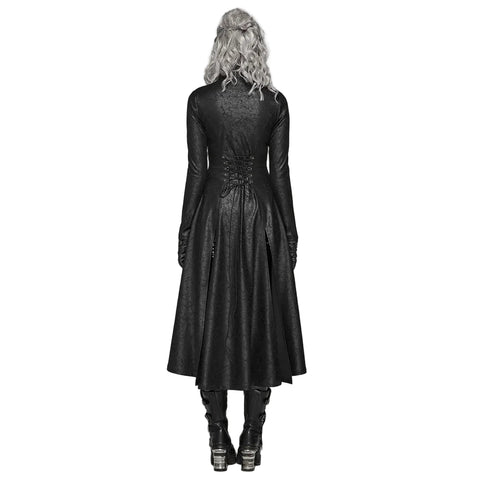 Die aufwendigen Details – von den Ziernähten bis zu den kunstvollen Hakenverschlüssen entlang des Taillenbereichs – verleihen dem Mantel Tiefe und Charakter. Der hochgezogene Kragen und der durchgehende Reißverschluss bringen einen Hauch moderner Stärke in das klassische Steampunk-Design.
