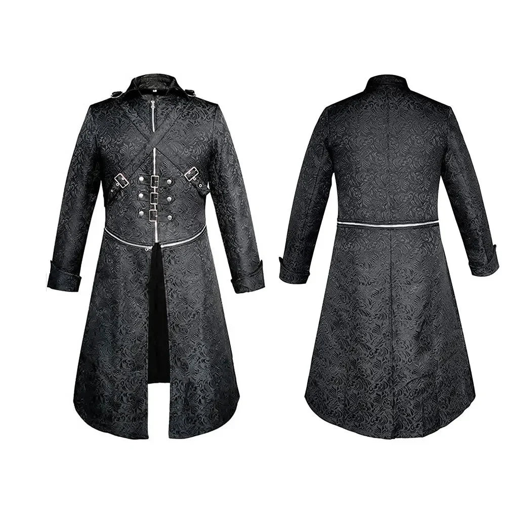 Der Steampunk Mantel Aristokrat vereint den Geist vergangener Jahrhunderte mit der rebellischen Energie der Steampunk-Welt. Mit seinem detailreichen Brokatmuster und den kunstvoll platzierten Schnallen wirkt er wie das Kleidungsstück eines Herrschers, der zwischen Tradition und futuristischer Vision wandelt.