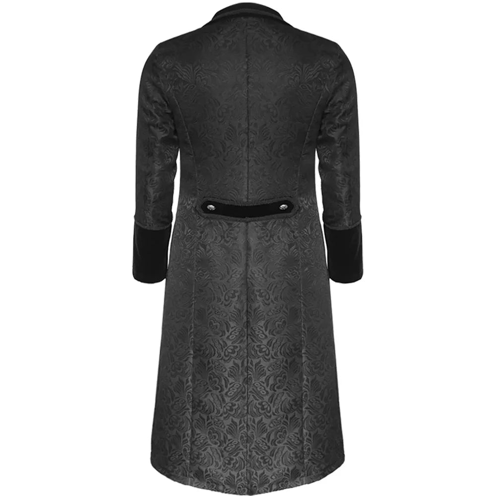 Die Kombination aus grauem Brokatstoff und schwarzen Samt-Elementen an Kragen und Manschetten verleiht dem Mantel eine ausdrucksstarke Silhouette. Die mittig angeordneten Knöpfe mit metallischem Glanz unterstreichen den aristokratischen Charakter. Ob als Teil eines vollständigen Steampunk-Outfits oder als stilvolles Einzelstück – dieser Mantel bringt die Faszination vergangener Zeiten in die Gegenwart.