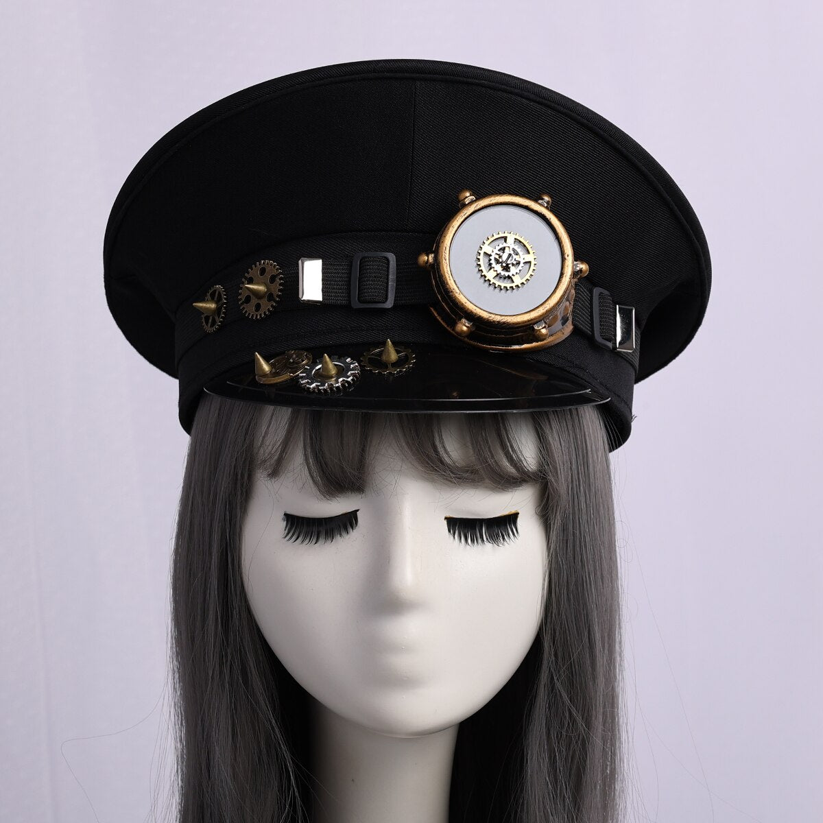 Auf der Vorderseite der Mütze prangt eine dekorative Uhr mit sichtbaren Zahnrädern, umgeben von Nieten und Metallverzierungen, die eine faszinierende Mischung aus Funktionalität und Steampunk-Ästhetik schaffen. Jedes Detail der Steampunk Militärmütze erzählt die Geschichte von Abenteuern und Erfindungen in einer fiktiven, mechanischen Welt. Perfekt für Cosplay, Kostümpartys oder als modisches Statement.