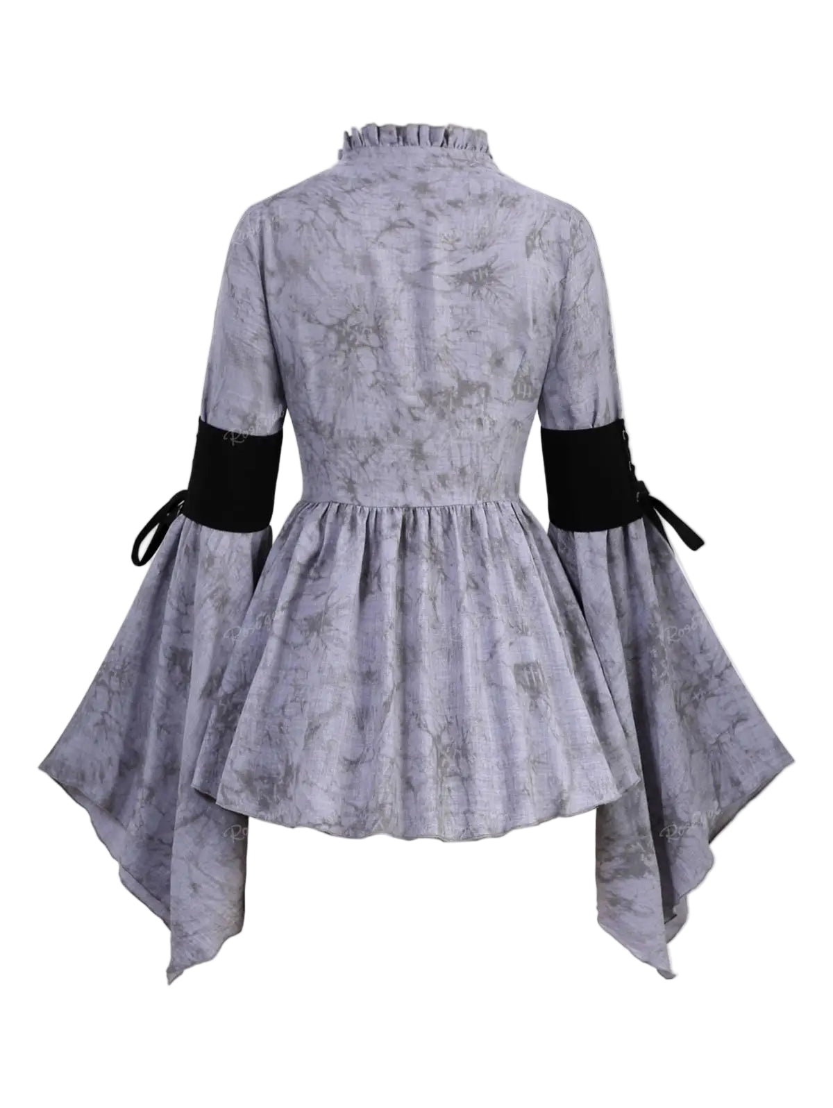 Besonders eindrucksvoll sind die weit ausgestellten Trompetenärmel, die mit schwarzen Bändern geschnürt werden und dadurch Kontrast und Struktur schaffen. Der asymmetrische Schnitt des Saums unterstreicht die Dramatik, während das feine Muster im Stoff eine fast magische Tiefe verleiht. Diese Bluse ist nicht nur ein Kleidungsstück, sondern ein Symbol für die Verbindung von Nostalgie, Kunst und der geheimnisvollen Aura des Steampunk.