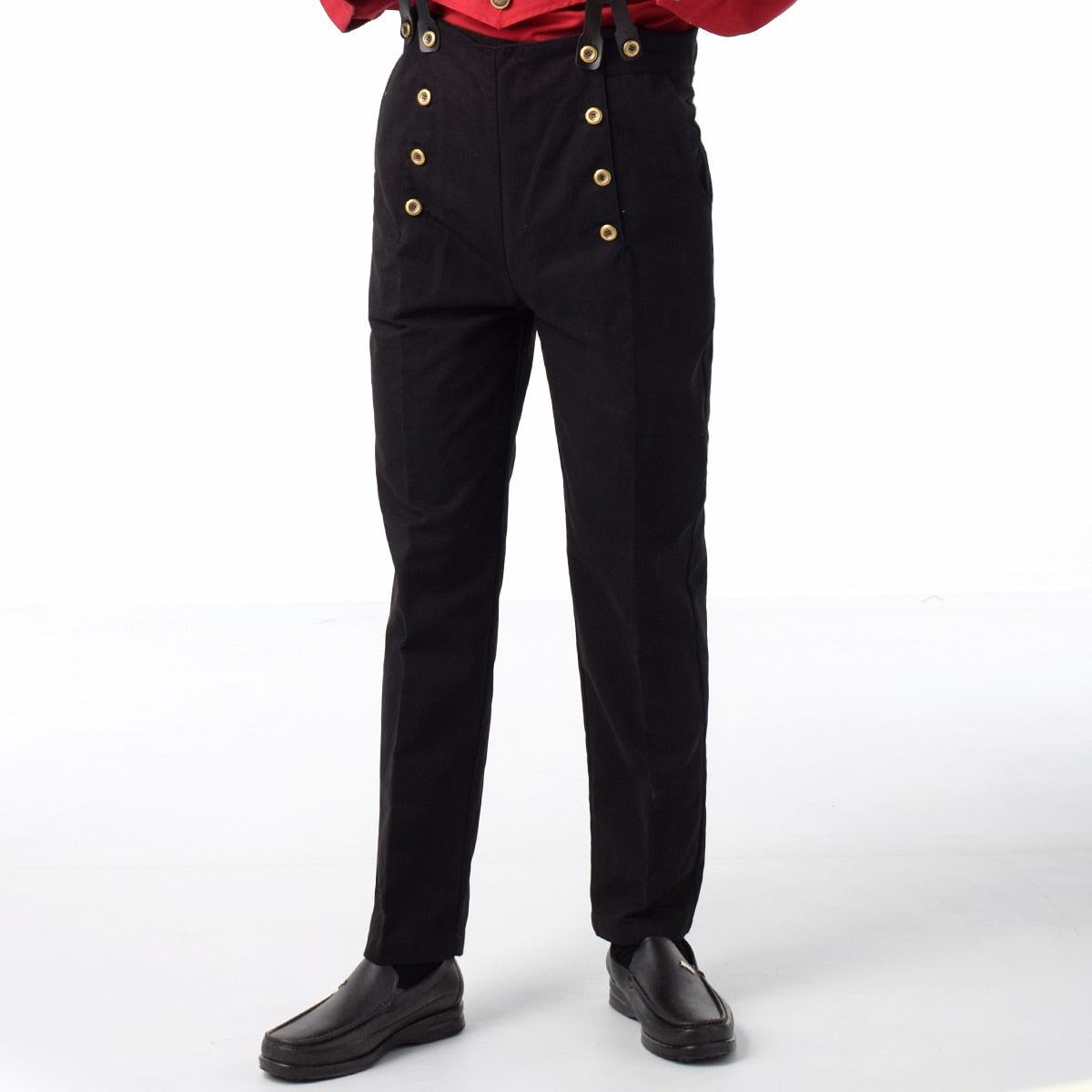 Die hohe Taille formt eine elegante Silhouette, während die seitlichen Taschen praktische Funktion bieten. Ob mit Weste, Militärjacke oder schnürbaren Stiefeln – diese Hose ist die Grundlage eines souveränen Ensembles für Cons, LARP, Bühnenauftritte oder stilvolle Alltagslooks im Neo-Viktorianischen Geist.