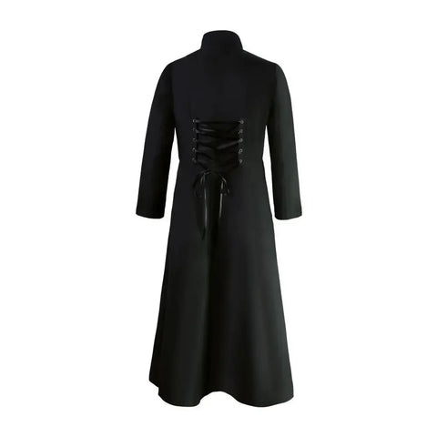 Die doppelte Knopfreihe, die sich bis zur Taille fortsetzt, betont die strenge Struktur des Mantels und verleiht dem Träger eine imposante Ausstrahlung. Gleichzeitig sorgt der hohe Schnitt und die elegante Linienführung dafür, dass er sich ideal mit Westen, Hemden und Hosen aus dem Steampunk-Universum kombinieren lässt.