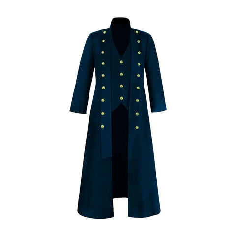 Der Steampunk Offiziersmantel strahlt die Stärke eines Kommandanten und die Würde eines Aristokraten aus. Mit seiner langen, fließenden Silhouette und den markanten goldfarbenen Knöpfen verkörpert er die perfekte Symbiose von militärischer Disziplin und viktorianischer Raffinesse.