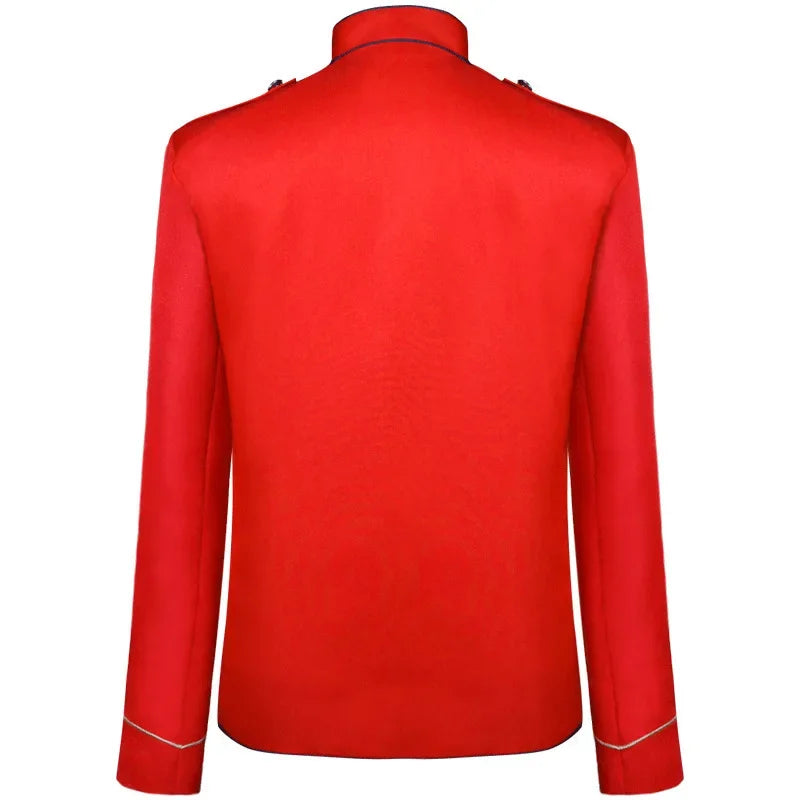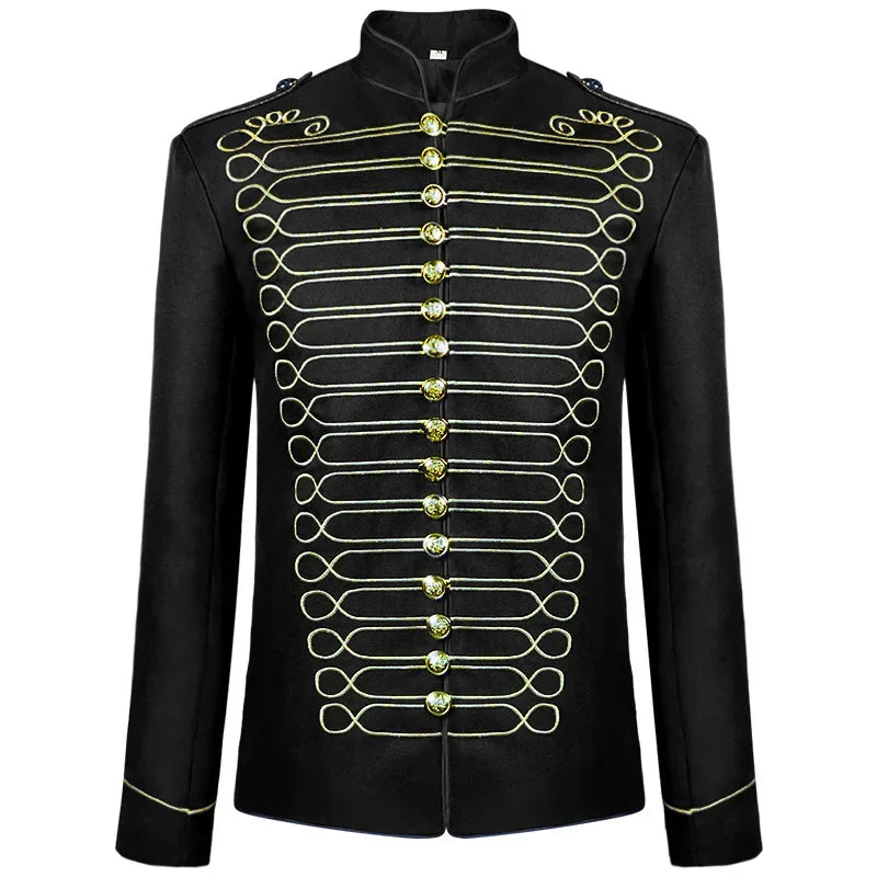 Die doppelte Knopfreihe mit geprägten Metallknöpfen, die kunstvoll gearbeiteten Kordeln und die präzisen Nähte schaffen ein harmonisches Zusammenspiel aus Struktur und Stil. Jede Linie, jede Naht, jedes Detail wurde entworfen, um Haltung zu betonen und Präsenz auszustrahlen. Ob auf einer Bühne, bei einem Festival oder in einem eleganten Auftritt – dieser Mantel zieht Blicke auf sich und bleibt unvergesslich.