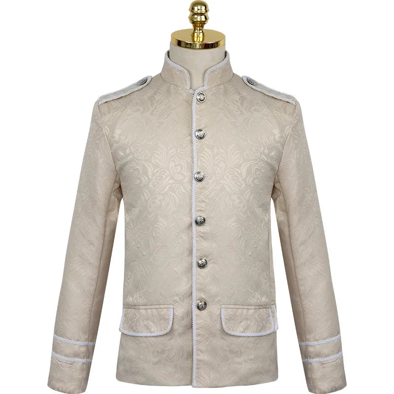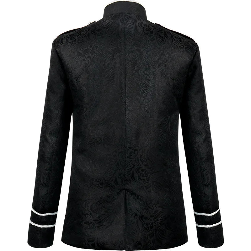 Das feine Jacquardmuster im Stoff verleiht der Jacke Tiefe und Charakter, während die glänzenden Metallknöpfe und die präzise gearbeiteten Paspeln an Kragen, Taschen und Ärmeln das Auge subtil leiten. Die Schulterpartien sind leicht betont, um Haltung und Stärke zu unterstreichen – ein Design, das Tradition und Moderne eindrucksvoll verbindet.