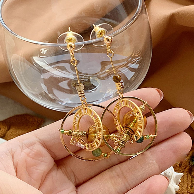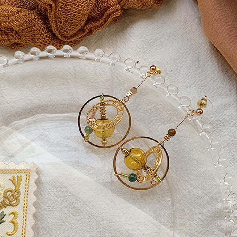 Im Zentrum der Ohrringe leuchtet eine goldene Kugel wie eine Sonne, umrahmt von filigranen Kreisen, die an Uhrwerke und Planetensphären erinnern. Kleine Perlen in Grün- und Brauntönen symbolisieren ferne Planeten, die ihre Umläufe um das Zentrum ziehen. Das Design wirkt wie eine Mischung aus Himmelsmodell und Steampunk-Mechanik – verspielt, geheimnisvoll und voller Energie.