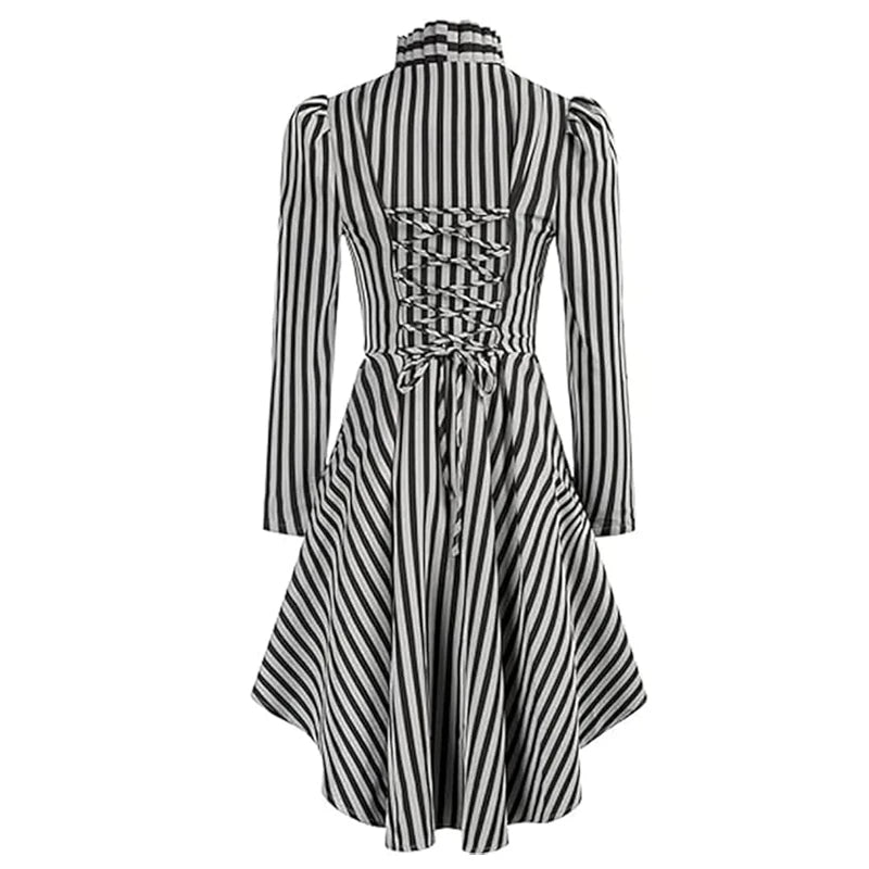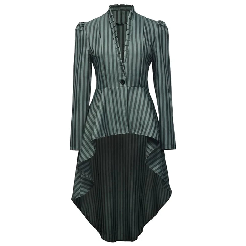 Die Steampunk Streifenjacke ist ein Kleidungsstück für all jene, die den Mut haben, zwischen zwei Zeitaltern zu wandern – dort, wo viktorianische Etikette auf rebellische Steampunk-Ästhetik trifft. Ihre markanten vertikalen Linien verlängern die Silhouette, verleihen Haltung und erinnern an die strenge Eleganz historischer Damenreitjacken, während der Schnitt modern, frei und bewusst unkonventionell bleibt.
