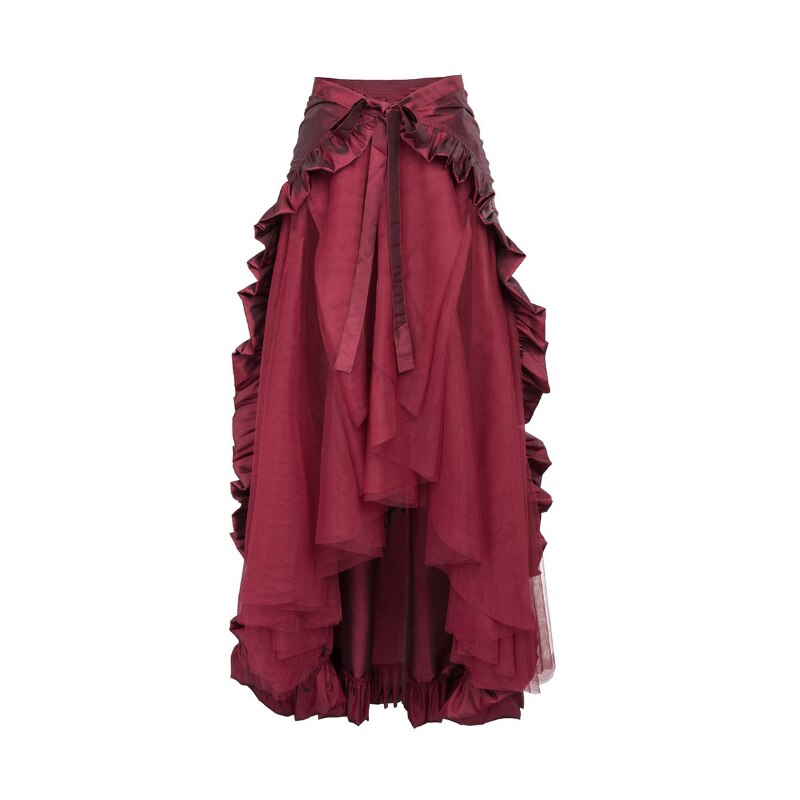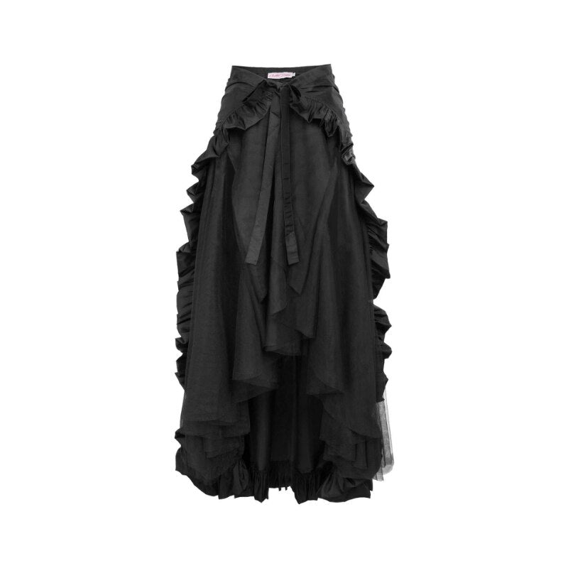 Das Design kombiniert rustikale Raffinesse mit femininer Eleganz: Der hohe Bund mit feiner Schleife betont die Taille, während die asymmetrischen Lagen aus leichtem Polyester einen dramatischen High-Low-Effekt erzeugen. Die zarten Rüschen an den Seiten verleihen dem Rock Volumen und eine weiche Struktur, die an die kunstvollen Kleider viktorianischer Ballgesellschaften erinnert – doch mit der rebellischen Note des Steampunk.