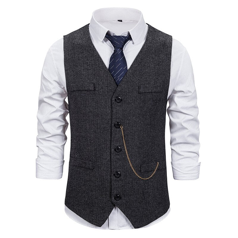 Die sorgfältige Knopfleiste und die funktionalen Taschen unterstreichen nicht nur die praktische Seite, sondern auch den authentischen Retro-Charakter. Ob kombiniert mit Hemd und Krawatte für einen noblen Look oder mit Mantel und Accessoires für ein dramatisches Ensemble – diese Weste ist vielseitig und stilsicher zugleich.