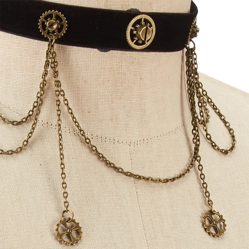 Mit dem Steampunk Zahnrad Choker tauchst du in die geheimnisvolle Welt der viktorianischen Technik ein. Auf dem weichen Samtband ranken sich filigrane Zahnräder und zarte Ketten, die an längst vergangene Uhrwerke erinnern. Dieses Collier umschmeichelt deinen Hals und verleiht dir einen Hauch von Eleganz und Rebellion zugleich – perfekt, um dich auf Festivals, in der Streetwear oder beim Cosplay aus der Masse hervorzuheben.