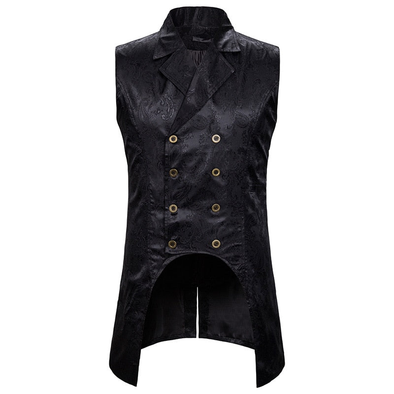 Das opulente Muster, kombiniert mit der markanten Länge und dem dramatischen Schnitt, verleiht dieser Weste einen majestätischen Auftritt. Die doppelte Knopfreihe unterstreicht den militärischen Einfluss, während der längere Schwalbenschwanz im Rücken dem Ganzen einen Hauch von Theater verleiht.