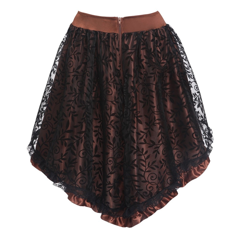 Die Kombination aus tiefem Braun und schwarzer Spitze erinnert an den Glanz viktorianischer Salons, in denen Stil und Anmut den Ton angaben. Der unregelmäßige Saum und die feinen Rüschen sorgen für Dynamik und betonen den romantisch-dramatischen Stil, der typisch für die Gothic- und Steampunk-Mode ist.