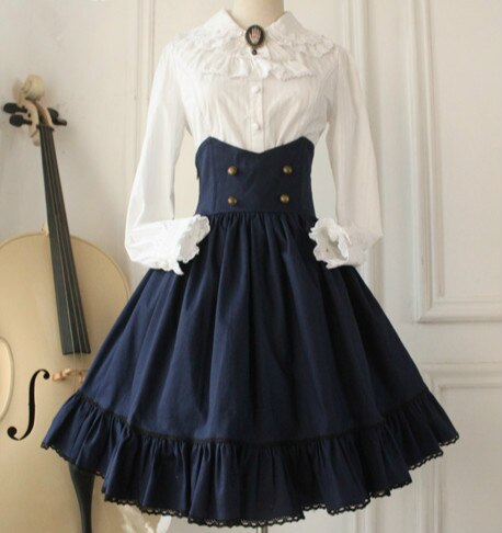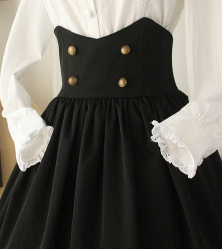 Der Viktorianischer Uniformrock erinnert an die zeitlose Anmut viktorianischer Hofdamen – doch mit einem Hauch militärischer Strenge. Sein tiefblauer Stoff fällt in sanften Falten, während die hohe, taillenbetonte Passform mit den vier metallischen Knöpfen an die Uniformen vergangener Offiziere erinnert. Eine perfekte Balance zwischen Ordnung und Romantik, zwischen Disziplin und Weiblichkeit.