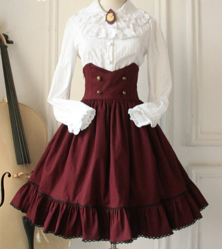 Der hochgeschnittene Bund formt eine anmutige Silhouette, die die Taille betont und den Rock voluminös und lebendig wirken lässt. Der breite Saum mit Rüschenabschluss bringt Bewegung in das Design und verleiht dem Stück einen feinen, fast tänzerischen Schwung. Das Material aus weicher Baumwolle sorgt dabei für Komfort und Halt – ob im Alltag, auf einem viktorianischen Ball oder bei einem Steampunk-Festival.