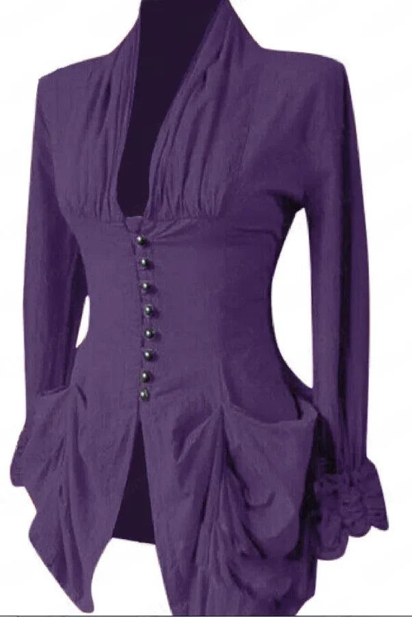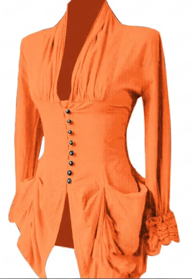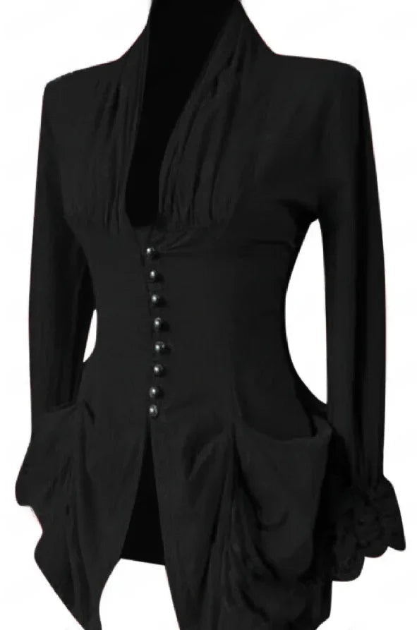 Die vordere Knopfreihe mit kontrastierenden Zierknöpfen unterstreicht die klassische Struktur, während der geschwungene Saum und die drapierten Taschen für einen fließenden, romantischen Fall sorgen. Die leicht betonten Schultern und der geraffte Ärmelabschluss erinnern an die Mode der Renaissance – elegant und raffiniert interpretiert für die moderne Trägerin.