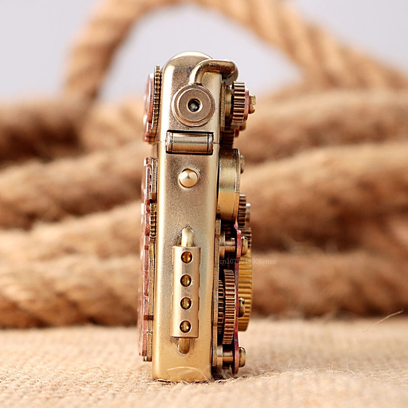 Dieses Vintage Feuerzeug ist ein wahres Meisterwerk der Steampunk-Ästhetik. Aus Metall gefertigt, zeigt es eine Vielzahl von Zahnrädern und Getrieben in Relief, die ein komplexes und faszinierendes Design schaffen.